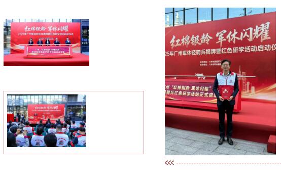 12月8日,以“红棉银龄 军休闪耀”为主题的广州军休轻骑兵工作室揭牌暨红色研学活动正式启动。仪式上,“广州军休轻骑兵工作室”庄严揭牌,轻骑兵工作队接旗出征,牛立志院长被聘为“广州市级‘红棉银龄 军休闪耀’军休轻骑兵”。这不仅是一份荣誉,更是一份使命。牛院长将继续发挥政治、经验与专业优势,以军旅故事教育人,以专业技能服务人,以崇高品德感染人,为广州经济社会发展注入温暖而坚定的“银发力量”。